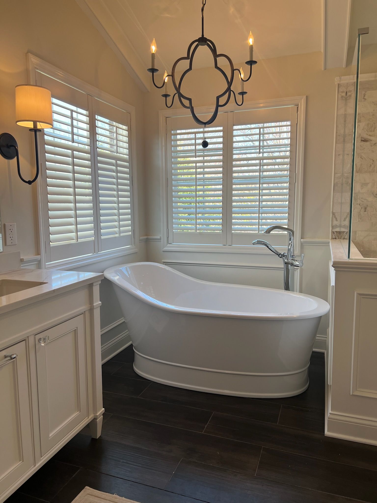 Palm Beach™ Polysatin™ Shutters are a great option for bathroom window treatments. They are made with a UV-resistant polysatin compound. This innovative material prevents them from warping, cracking, fading, chipping, peeling or discoloring over time, even in high humidity.